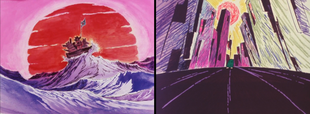 While, as I said, A Pro and Madhouse had already worked together, this was the first time that A Pro would work under Madhouse, that is Dezaki’s direction, for an entire show and not just for some episodes. In a fascinating interview about the show, Dezaki talked about its production in detail, especially the “clash” of the two studios’ “philosophies”. Recently, the concept of kantoku-nashi (director-less) has appeared in sakuga circles, and I think it’s especially suited to describe A Pro, and why working under Dezaki would’ve been so hard for them. According to Dezaki [1997], “In the Mushi Pro school of thought, the director sits at the top. This was why the production process at Tokyo Movie felt off […]. Even their drawing style was quite different.” He also recounts how he corrected an animator that just made the sea blue and asked his team to “drop the idea that the water must be blue”, since it changes colors according to the time and atmosphere.