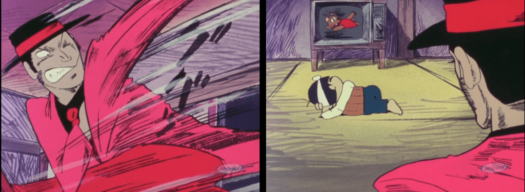 On the other hand, if Dezaki’s episodes also rely a lot on exaggeration, the way they do so is very different. One of the major differences is the heavy use of techniques directly imported from American cartoons, such as colorful impact frames or very obvious squash-and-stretch, something that’s always been rare in Japanese animation. What also sets Dezaki’s episodes apart is that they’re immediately recognizable, for many reasons. First, the direction is always a step higher than in all other episodes, whether in terms of shot composition, staging, or creativity. Then, they’re often the craziest episodes, where gags go completely over the top – such as #12A, where a Christian cultist convinces Bakabon and Papa to build a new Noah’s Ark or #27B about a crazy mouse invasion with a lot of Gamba easter eggs. These also appear in #15A, probably the best for any Dezaki fan, since it features a lot of parody and easter eggs, like exaggerated harmonies with manga-like onomatopoeia or Papa watching Gamba on TV.