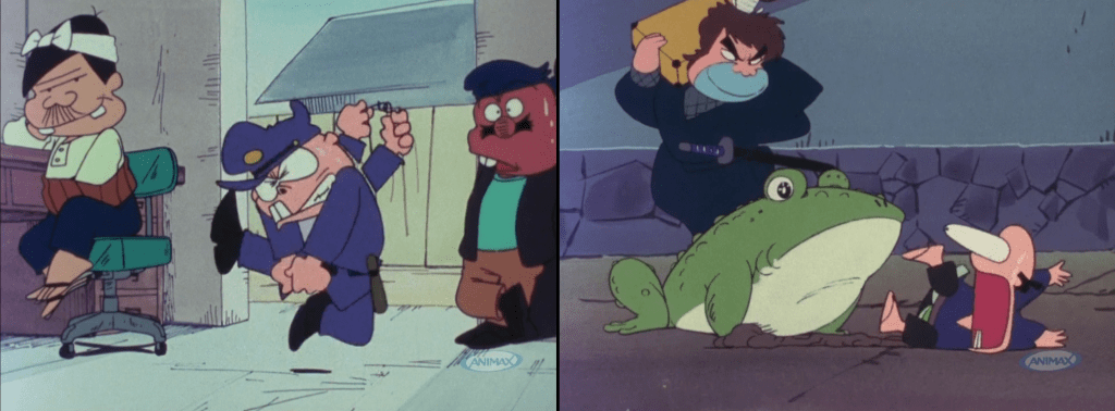 (1) But the credits can sometimes lead to errors : on 1972’s Gutsy the Frog, it seems that only 4 key animators could be credited by episode ; this led to the use of pseudonyms like “Sugi Take” (Akio Sugino + Takekatsu Kikuta) or “Ohashi Toshi” (Manabu Ohashi + Toshio Nitta)