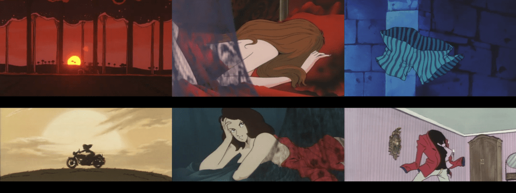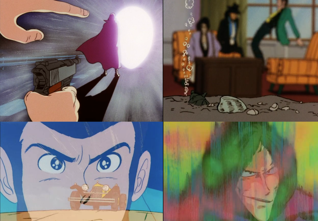However, it’s not like Miyazaki took for himself all the creative responsibility. In that regard, the best example are the 4 (#3,#7,#13 and #17) episodes storyboarded by Dezaki, who hadn’t even left Mushi yet – which is why he did them under a pseudonym, Sai Kuyo (probably a double pun on “saa iku yo”, “come on” and “kusai yo”, “it’s a pain”). This was his first collaboration with Miyazaki, and as can be expected, they’re among the best of the series. My favorite is #13, which by the way prefigures a later Lupin movie since its antagonist is time-traveller Mamo. It features all the classical Dezaki visual vocabulary : a strong sensibility towards lighting and depth of field, experimentations with superimpositions and color… But it also manages to be one of the most absurd and fun episodes (all of Dezaki’s are pretty absurd, but this one is a step further), while staying very dramatic all along – it basically plays perfectly between the two registers of Dezaki’s style.