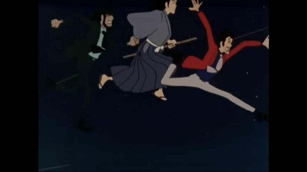 But the fact is that Miyazaki’s and Takahata’s influence on the series was huge. You can see it by comparing their work with the Osumi episodes, but also by looking at what Lupin became in its later installments. While keeping the fundamental conceit of the series, they started changing the characters and atmosphere of the show. For example, Goemon stops being a dark and dangerous samurai but is used more often for comic relief : Miyazaki himself reminisces about the last episode, where the scenario is pushed to its limits when “we had Goemon tunnel below a huge, seemingly impregnable bank vault and then slice a hole in the floor with his sword, and we showed Inspector Zenigata reduced to tears” [Miyazaki, 2009, p.280]. The general impression given by Miyazaki is that of a chaotic production (he says the producers made apologies to the staff once the show was over), which didn’t stop the staff from having a lot of fun with the thing.