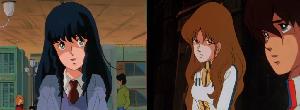 For the other members of the staff, Hirano brought on many of the people he had had the opportunity to meet in his already rich career. It was the third work of Shinji Aramaki as mechanical designer, after Genesis Climber Mospeada and Megazone 23. In terms of key animation, three members of Graviton (that had already dissolved or was on its way to) were brought in: Shôichi Masuo on episode 1, Kôji Itô on 2, and Hiroaki Gôda on 3. Besides them, it’s worth noting the presence of Hiroyuki Kitazume and his small studio Pack (that existed between 1984 and 1987) on episode 1—it’s probably Kitazume who sneaked in some characters from Z Gundam, on which he was animation director at the same time. Finally, most of the character animation was handled by Hirano’s wife, Narumi Kakino’uchi—they had met in Beebow and would keep working together for a long time for AIC, Kakino’uchi handling character designs on Vampire Miyu and Ryokunohara Labyrinth in the early 90’s.