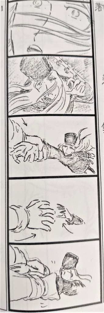 The first is this one, where Maetel falls down and is saved by Tetsuro. In the storyboard, the general course of the action is rather detailed and very clear: we can see Maetel’s fall and follow the movement quite easily. The written indications are also only descriptive: “Maetel falling” or “Tetsurô’s left hand catching Maetel”. However, there are two essential things missing: the precise rhythm of the action, and the exact trajectory of the characters. That’s where Kanada’s animation fills in the blanks and offers a great bit of animation. The first thing to note is how off-model the characters are: here, it’s especially visible in the way the hands are drawn. The fingers are very slim and long, unusually and unnaturally so, especially when compared to the storyboard. This is characteristic of Kanada: in the movie in particular, he drew Tetsuro with very slim legs, for example. The other element is the care put into Maetel’s expression. Kanada went so far as to make her blink – characters in animation never blink, but here he added it for realism and expressivity: in fear, Maetel closes her eyes. Another striking element is when Tetsurô’s hand suddenly enters the frame: Kanada added his characteristic speed lines, which help put the corner of the screen into focus and give enough of an impression of strength into the young man’s motion.