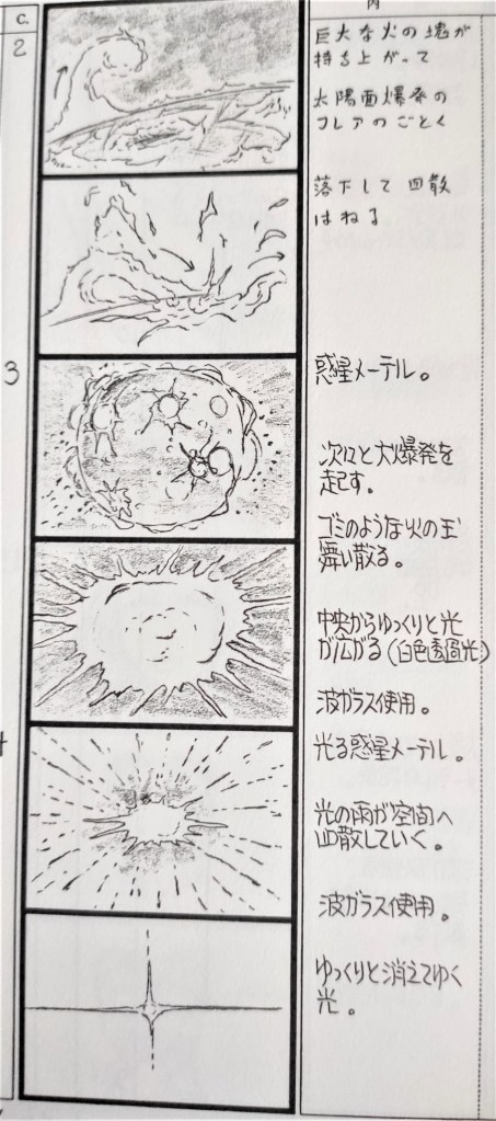 The storyboard for the collapse of Planet Maetel. Translation of the annotations: “Giant mass of flames rises up like a solar flare / Falls down and scatters / Planet Maetel / Large explosions keep going off one after another / Balls of fire get scattered around like garbage / Light slowly expands from the center (penetrating white light) / Use waving glass / Shining Planet Maetel / Rain of light scatters through space / Use waving glass / Light slowly fades out