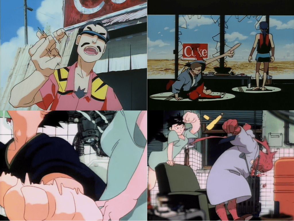 It is therefore no surprise if two of Download’s foremost animators, Kazuyoshi Yaginuma and Tatsuyuki Tanaka, were pure products of the realist school. The two men were intimate friends and had both started their career in studio Telecom. Close friends with Takashi Nakamura and Shin’ya Ohira, they were at the center of the realist circle, and Tanaka even made his debut as key animator on Akira, before working on Gosenzosama Banbanzai where he met Iso. Tanaka’s animation is probably one of the highlights of Download. It is highly modulated, switching freely between 1s and 4s, close and wide spacings. This creates a sense of frenesy, furthered by the multiplication of movements of all parts of the body, clearly inspired by Iso. The other Iso inspiration is probably in the smears: whereas Kanada school animators like Shinsaku Kôzuma used wide, deformed smears that exaggerated the motion, following Gosenzosama, Iso pioneered smaller smears that would only distort the outlines of objects, most notably of the hands: they were in the service of dynamism rather than deformation for its own sake. All in all, there’s a very fun and cartoony aspect to it, that’s the perfect crossing point between Gosenzosama’s expressive animation and Kanada’s crass, body-centered kind of humor.