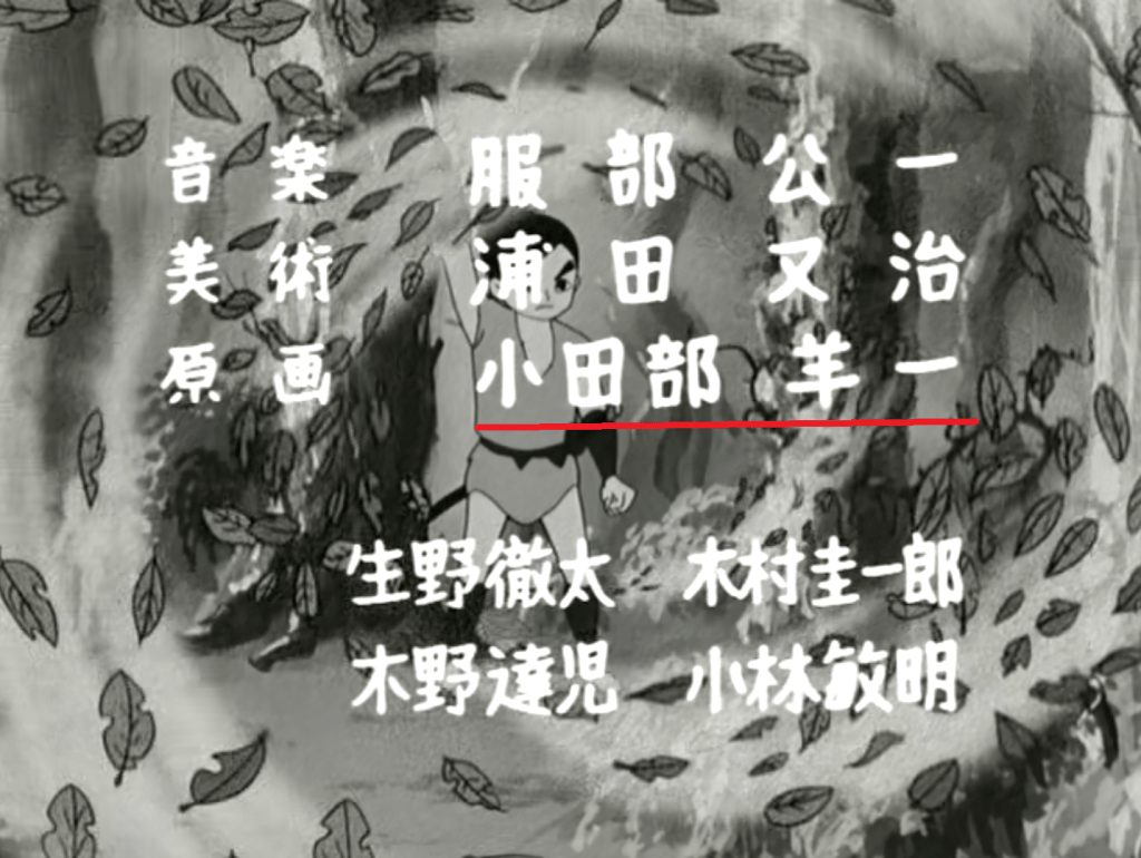 In-betweens: Yoshio Kabashima (椛島義夫), Fumio Hairamura (?) (平村文男), Akira Hotta (堀田誠), Isamu Tamazawa (?) (玉沢武), Tadashi Shirakawa (白川忠志), Okano Shômei (?) (岡野正明)