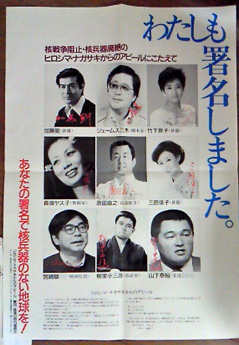 The first one is a poster, issued by the JCP-related anti-nuclear organization “National Committee for the Appeal of Hiroshima and Nagasaki [for the ban of nuclear weapons]”, which featured pictures of actors such as Gô Katô, Keiko Takeshi, and director Hayao Miyazaki. This exceptional document was circulated throughout the entire Japanese film industry, including animation studios.