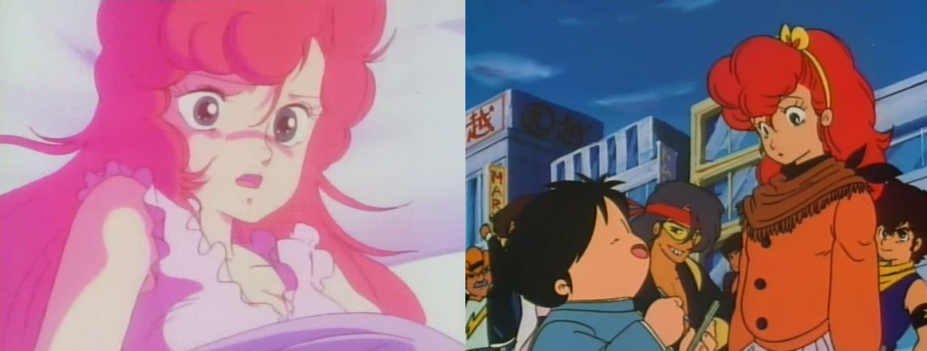 In any case, these four episodes were made in exceptional conditions, for one single reason: Kaname had so much freedom that they could entirely redraw the character designs. Inomata didn’t need to be asked twice, and as one can expect, her style is all over the drawings. Just as in Acrobunch, she made characters taller, prettier and added details everywhere. What is particularly interesting is that those episodes were made as Sanshirô was in preproduction, and it’s possible to see how much Sanshirô’s Kyôko influenced Inomata’s re-designing of Sarutobi’s Mako. Even more curious is a character recurring in two of the four episodes (#05 and #23), named Yôko, whose design and especially bright red hair shares multiple similarities with the protagonist from Genmu Senki Leda.