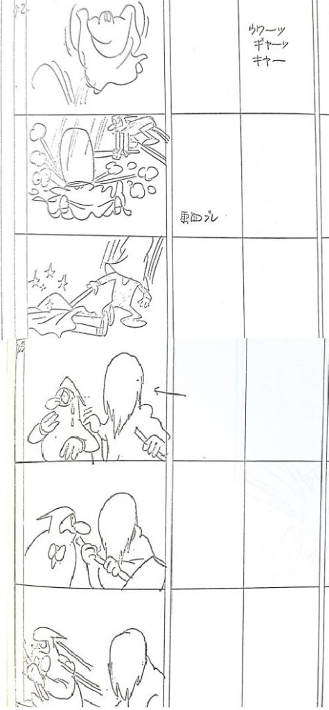 In fact, this latter scene seems to be the one where the animator took the most liberties. Just one cut prior, one of the humans is mistaken for a ghost and violently hit by one of his comrades with a hammer. The storyboard only indicates the hit and then the victim on the ground, whereas the animator added a brief “puffing” motion of the head, which grows into a huge bump under the hit. In other instances, the animators would add smears where they’re not indicated or add small movements.