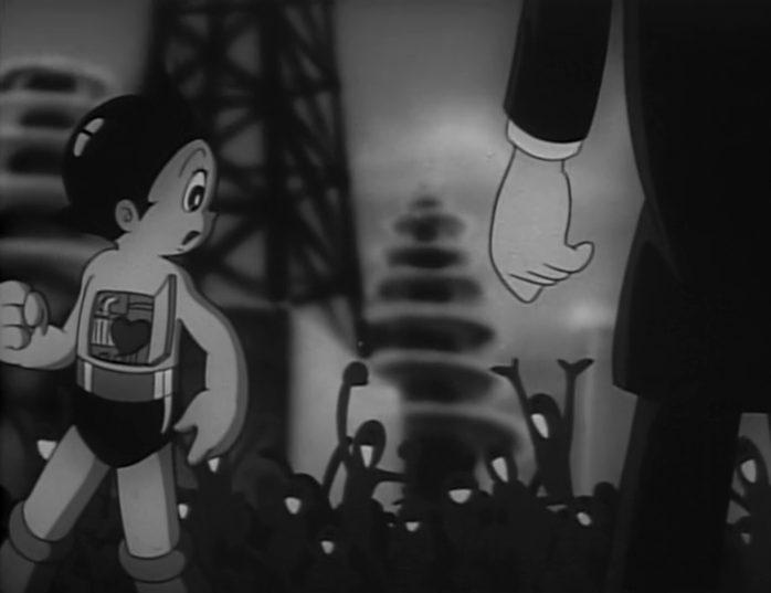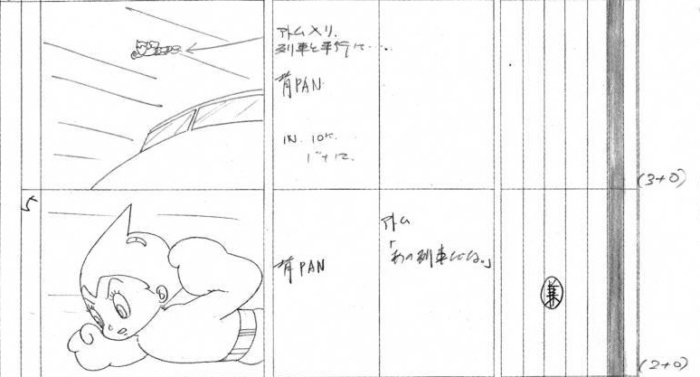 – Lastly, for scene 2/cut 4, I read the indication as 「アトム入り、列車と平行に…」= “Atom enters, runs parallel to the train…”. In this case, unlike what you wrote, the movement is actually indicated, albeit not explicitly if we were to translate the indication literally. Indeed, the word used here sometimes includes the action of running parallel to something. This is what is depicted in the final rendition: Atom runs parallel to the train, at the same speed.