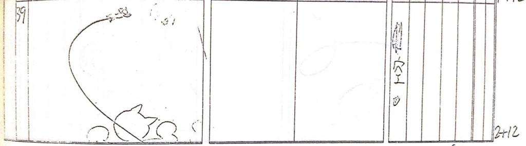Modern storyboards usually contain 5 columns: from left to right, cut (shot) number, pictures, written description of each cut, lines, and number of seconds & frames. Mushi’s boards were almost identical, except for the last column, broken down in 7 sub-categories: background, music, special effects, photography, genga, douga. These are quite clearly indications for each section, and this space must have been used to indicate the length of each new element as well as bank cels, backgrounds, or sound effects.