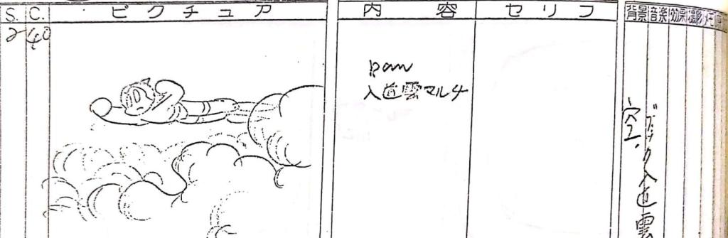 Staying on the written indications, it is notable that bank cels are not explicitly mentioned in the storyboard. For example, at scene 2, cuts 39-40, Atom’s flight is bank animation, but the only things written in the storyboard are “sky” (?) for cut 39 and “multi [multiplane] on the clouds” for cut 40 – in other words, indications for the background and photography teams (note how the speed or number of frames at which the clouds are supposed to move is not indicated). It’s only when cuts from the same episode are repeated (in this case, the entirety of scene 7) that “repeat” indications are given. In other cases, it would likely have been the role of the assistant director or production team to realize that bank cuts would work at a certain place and insert them.