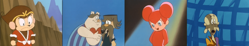 The discussions of Goku’s animation style are contradictory. According to Seiji Okuda, the character designs were made by Sugii himself, and they – alongside Miyamoto’s direction – were quite challenging because they moved away from Tezuka’s style and its simple round shapes to favor a sense of volume. On the other hand, according to Sugii, Miyamoto in particular didn’t fit well in Mushi and on Goku because he had little experience drawing in Tezuka’s style – implying that the show’s aesthetic kept following it [13]. I tend to agree with Okuda there: Goku’s designs keep a sense of simplicity, but that is the common element of most 60s anime and doesn’t just belong to Mushi; except for Ryûko, they had none of the roundness and cuteness characteristic of Tezuka’s characters. In particular, the guest designs, which is where true variety emerged, have nothing to do with Tezuka’s sense and do feel closer to American animation.