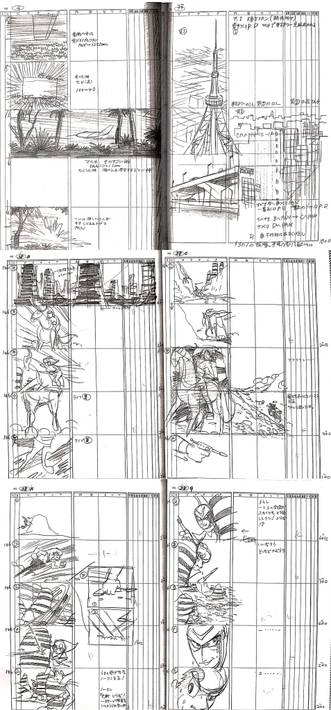 Tezuka’s “ambitious” storyboards from 0 Man (top) and Norman (middle and bottom) [From Tezuka 1999b]